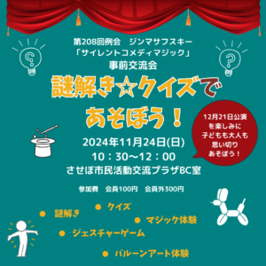 謎解きやクイズ、他にもジェスチャーゲームやバルーンアート体験などで子どもも大人も遊んで、例会当日を楽しみに迎えよう!
