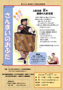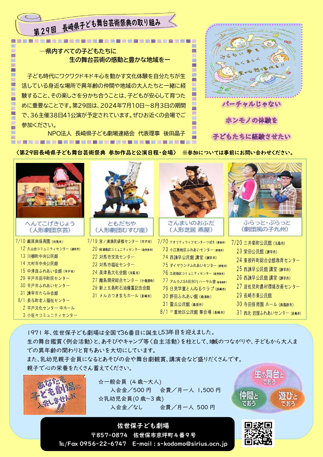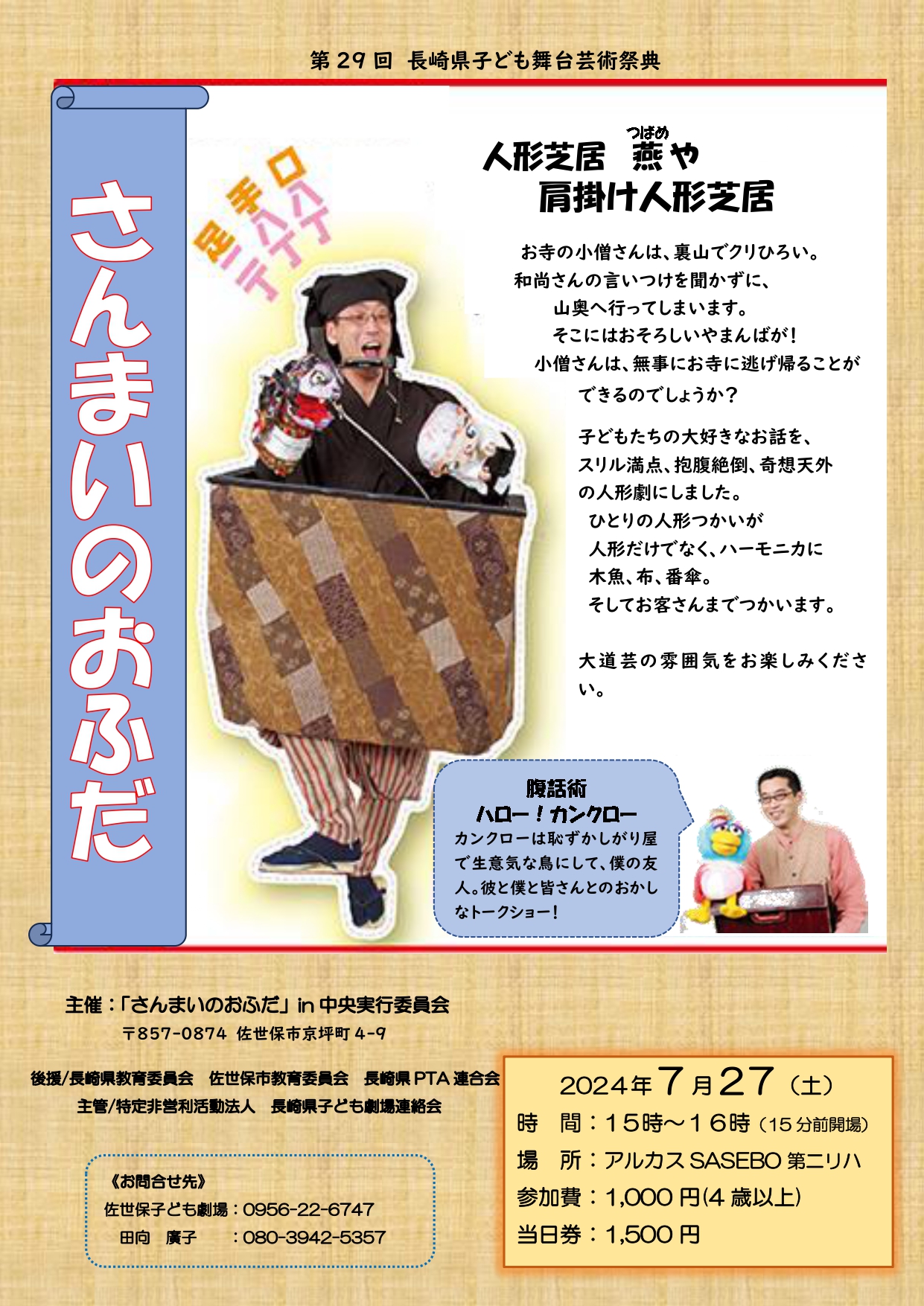 2024年7月2日 / 最終更新日時 : 2024年7月2日 s-kodomo 地域公演 【子ども舞台芸術祭典】さんまいのおふだ カレンダー カレンダーに追加 Timely カレンダーに追加 Google に追加 Outlook に追加 Apple カレンダーに追加 他のカレンダーに追加 XML ファイルとしてエクスポート 日時: 2024年7月27日 @ 3:00 PM – 4:00 PM 2024-07-27T15:00:00+09:00 2024-07-27T16:00:00+09:00 場所: アルカス佐世保第2リハーサル室 佐世保市三浦町2-3 参加費: ひとり1,000円(4歳以上)当日券:1,500円 お問い合わせ: 080-3942-5357(田向) 0956-22-6747 メール イベントのサイト 地域公演 人形芝居 燕や 肩掛け人形芝居 さんまいのおふだ お寺の小僧さんは、裏山でクリひろい。和尚さんの言いつけを聞かずに、山奥へ行ってしまします。そこにはおそろしいやまんばが!小僧さんは、無事にお寺に逃げ帰ることができるのでしょうか? 子どもたちの大好きなお話を、スリル満点、報復絶倒、奇想天外の人形劇にしました。ひとりの人形つかいが人形だけでなく、ハーモニカに木魚、布、番傘。そしてお客さんまでつかいます。 大道芸の雰囲気をお楽しみください。 Facebooktwitter コメントを残す コメントをキャンセルメールアドレスが公開されることはありません。 ※ が付いている欄は必須項目ですコメント ※ 名前 ※ メール ※ サイト 次回のコメントで使用するためブラウザーに自分の名前、メールアドレス、サイトを保存する。