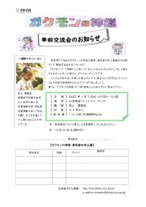 2022年2月13日 / 最終更新日時 : 2023年1月8日 s-kodomo 事前交流会 【事前交流会】『ガクモンの神様』 カレンダー カレンダーに追加 Timely カレンダーに追加 Google に追加 Outlook に追加 Apple カレンダーに追加 他のカレンダーに追加 XML ファイルとしてエクスポート 日時: 2023年1月7日 @ 2:00 PM – 4:00 PM 2023-01-07T14:00:00+09:00 2023-01-07T16:00:00+09:00 場所: 山澄地区コミュニティセンター 佐世保市潮見町14-14 参加費: 100円(保険料込) お問い合わせ: 佐世保子ども劇場 0956226747 メール 事前交流会 チラシはこちらからどうぞ 『ガクモンの神様』の脚本・演出家の西上寛樹氏をお招きして、事前交流会をおこないます。 「ガクモン??」「神様??」と思っている小4以上の子どもたち、そして昔は子どもだった大人の皆さん、またとないチャンスです。 たくさんの引き出しを持った西上さんです。西上さんの引き出しからたくさんのお宝を佐世保のみなさんで引っぱり出しましょう。皆さん「ガクモンの神様」を100倍楽しむためにぜひご参加ください。 *チラシの時間から変更となっておりますのでご注意ください。 Facebooktwitter コメントを残す コメントをキャンセルメールアドレスが公開されることはありません。 ※ が付いている欄は必須項目ですコメント ※ 名前 ※ メール ※ サイト 次回のコメントで使用するためブラウザーに自分の名前、メールアドレス、サイトを保存する。